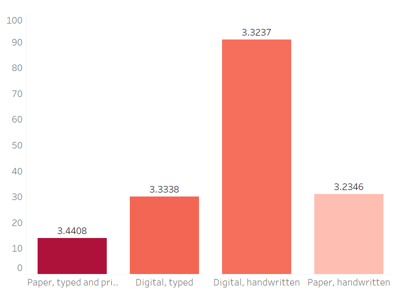 In this data set, most students prefer digital and handwritten notes i.e. on tablets with a digital pencil, followed by paper and handwritten, digital and typed, and finally paper which is typed and printed. Interestingly, both forms of digital notes have approximately the same average grade. Using paper (typed and printed) notes, e.g. book chapters, seem to have a slightly higher average grade.